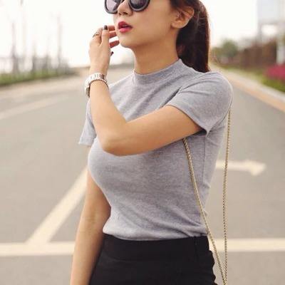 เสื้อยืด2025สำหรับผู้หญิง, เสื้อยืดแขนสั้นปกสูงครึ่งปกสีล้วนสำหรับผู้หญิงเสื้อยืด