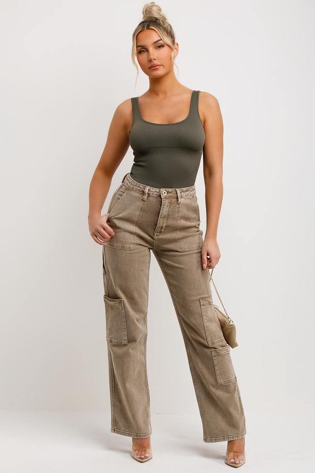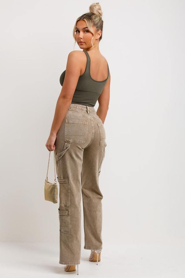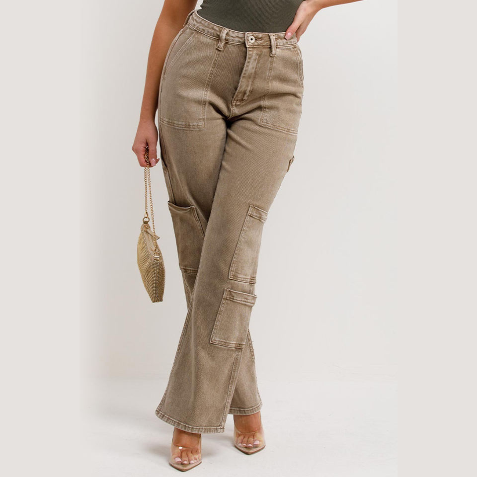 กางเกงยีนส์ซักลายกรดสำหรับผู้หญิงสีน้ำตาลแบบแบนสีน้ำตาลทันสมัย2025ออกแบบได้ตามต้องการสำหรับฤดูร้อน