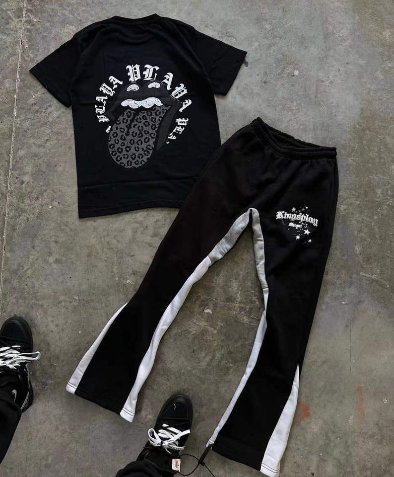 ชุดเซ็ตเสื้อยืดพิมพ์ลายแบบดิสเทรสปี 2025 กางเกงวอร์มขาบานทรงโอเวอร์ไซส์ ชุดวอร์มย้อมสีแบบแอซิดวอช ไซส์พลัส ผ้าฝ้าย ระบายอากาศได้ดี เหมาะสำหรับเล่นกีฬา