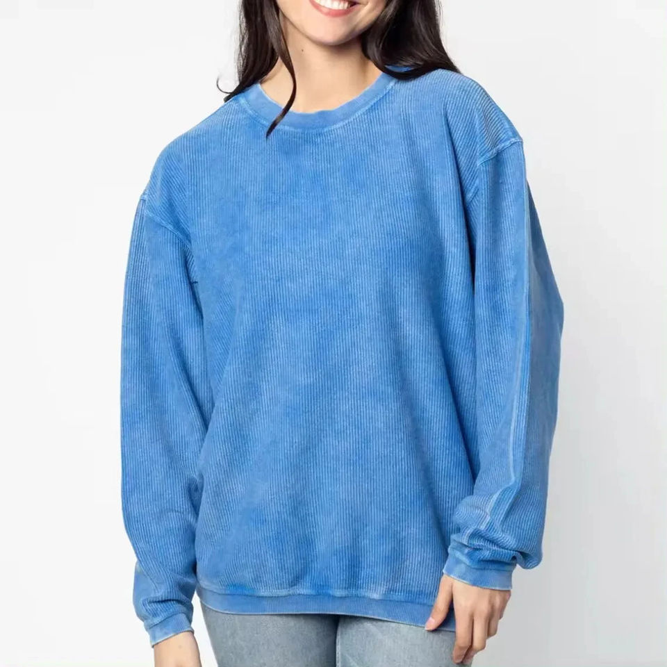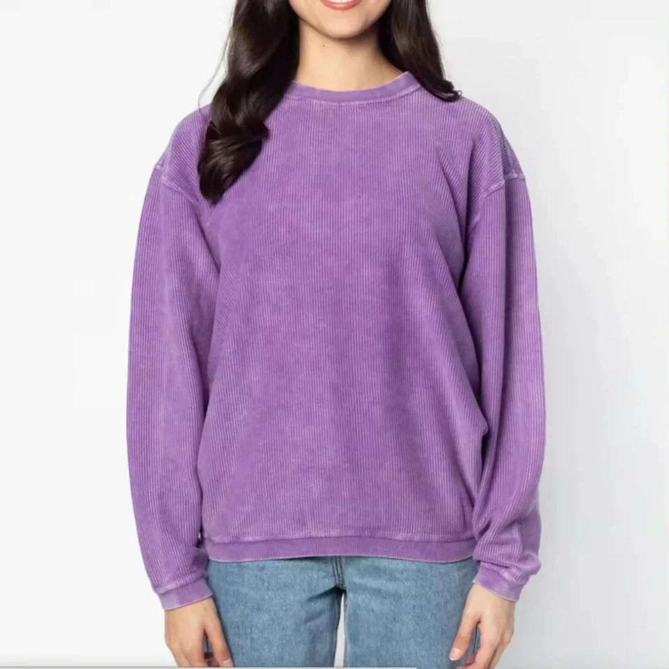 เสื้อสเวตเชิ้ตสตรีแบบสตรีทแวร์ ปี 2025 ลายโลโก้แบบกำหนดเอง ล้างสีแบบ Acid Wash แขนยาว ระบายอากาศได้ดี เป็นมิตรต่อสิ่งแวดล้อม