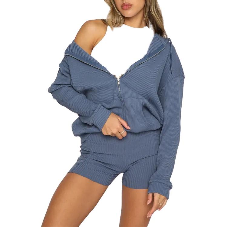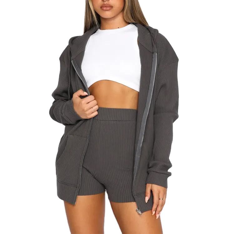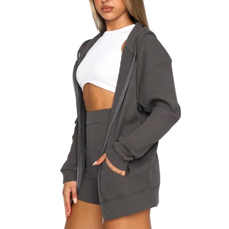 2025ชุดกีฬามีฮู้ดมีซิปขนาดใหญ่พิเศษมีรู2ชิ้นลายริบบิ้นออกแบบโลโก้ได้ตามต้องการสำหรับผู้หญิงขายส่งเล่นกีฬา