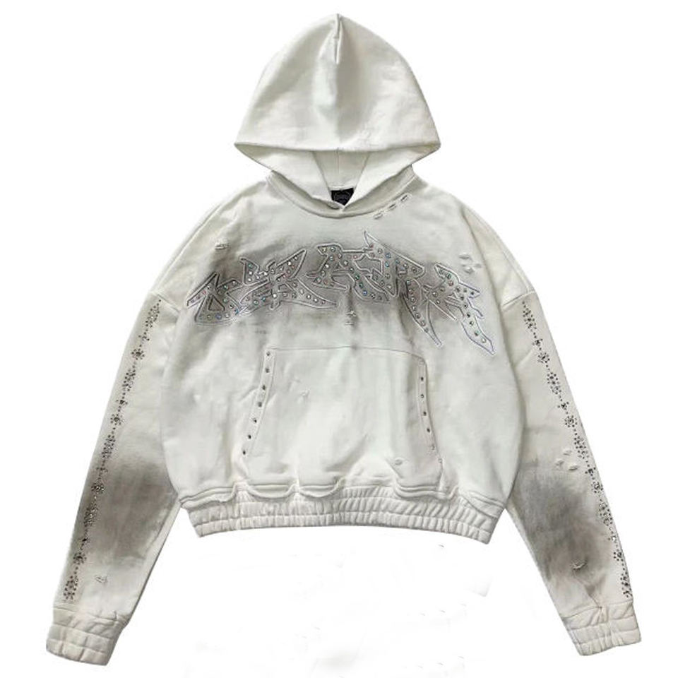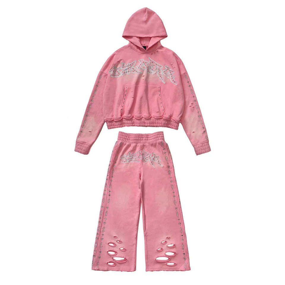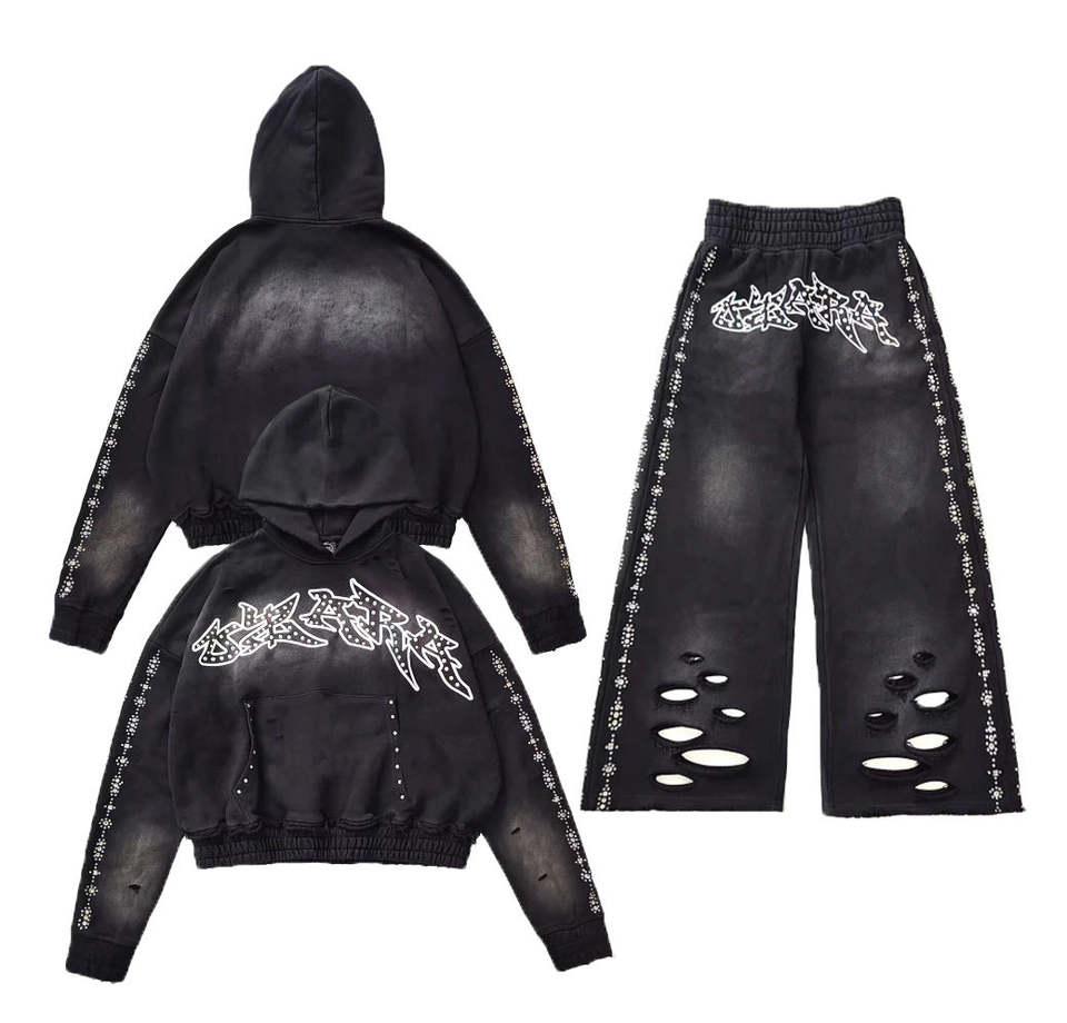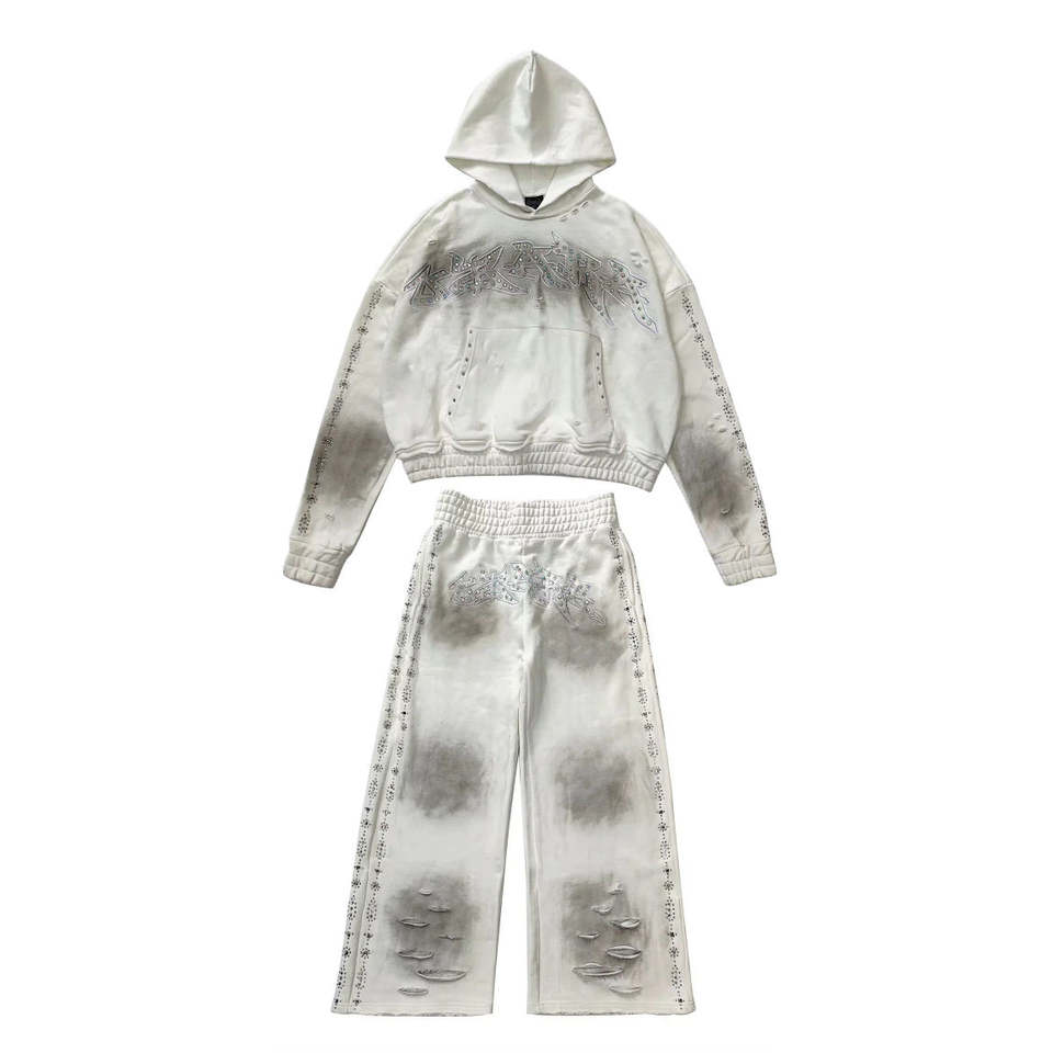 ชุดฮู้ดดี้และกางเกงวอร์มปักลายหรูหราแบบสั่งทำปี 2025 ลายกราฟิกวินเทจประดับคริสตัลทรงบ็อกซี่ฟอกสีสไตล์สตรีทแวร์สำหรับทุกเพศ