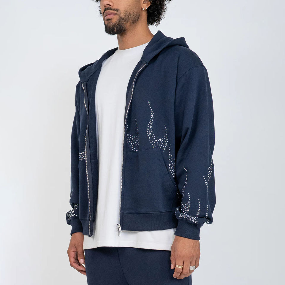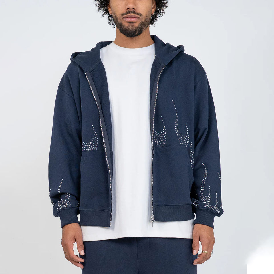 ชุดเซ็ตเสื้อฮู้ดและกางเกงวอร์มผ้าฟลีซแต่งซิปประดับคริสตัล สไตล์สตรีทแวร์ลำลองสำหรับฤดูหนาว ปี 2025 ผลิตตามสั่ง ล้างสีแบบแอซิดวอช สำหรับผู้ชาย 100%