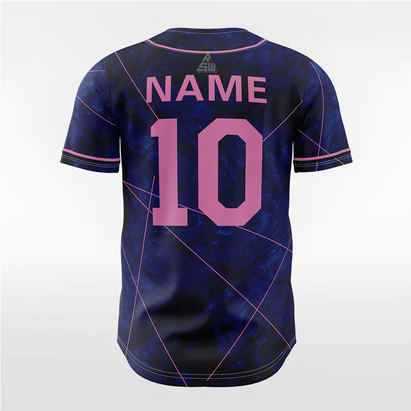 เสื้อเบสบอลสีน้ำเงินกรมท่าแบบสั่งทำปี 2025 แต่งกระดุมสีชมพู ชุดทีมพร้อมปักชื่อและหมายเลขแบบมืออาชีพ แขนสั้น พิมพ์ลาย