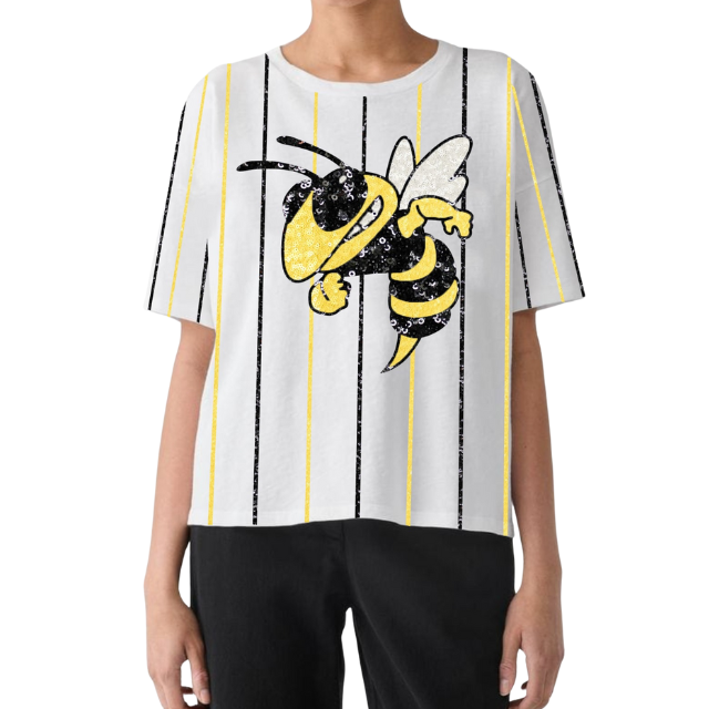 เสื้อยืดคอกลมสำหรับผู้หญิงลายทางแนวตั้งปักเลื่อมลายเกมวันเกมลำลองออกแบบได้ตามต้องการ2025