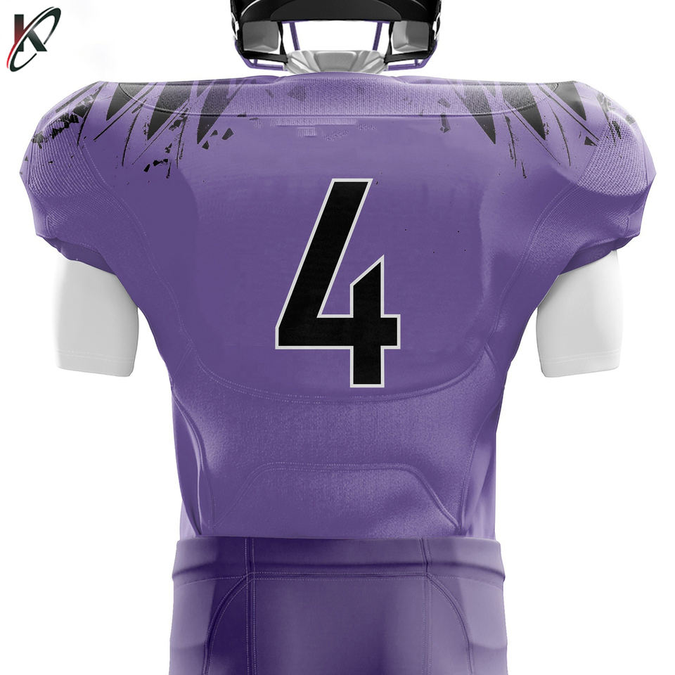เครื่องแบบฟุตบอลอเมริกันระเหิดแบบกำหนดเอง2025อุปกรณ์ระบายอากาศผ้าทอลายทแยงขนาดพิเศษผลิตสำหรับผู้เล่นสีม่วงสีขาว