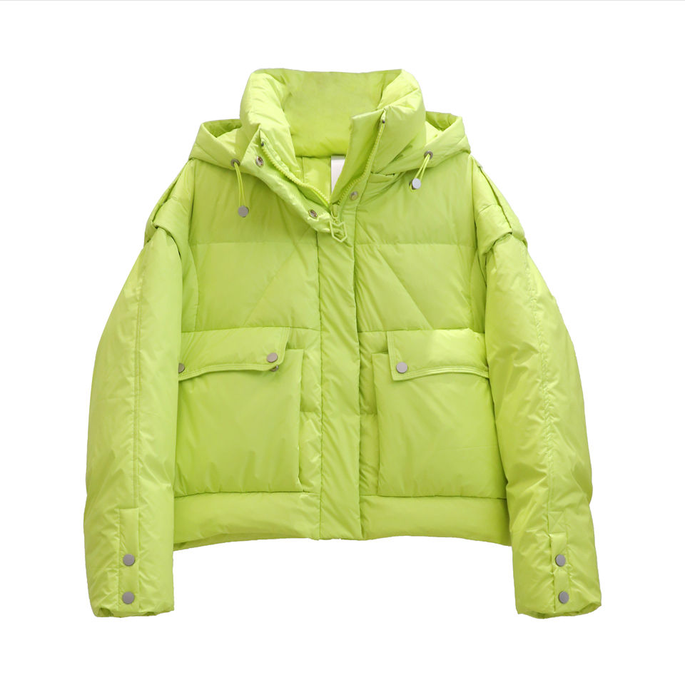 เสื้อโค้ทบันหนาวตัวสั้นมีฮู้ดสำหรับผู้หญิงขนาดใหญ่พิเศษเสื้อแจ็คเก็ตขนเป็ดผ้าโพลีเอสเตอร์มีลายทางปรับแต่งโลโก้ได้ตาม2025ได้