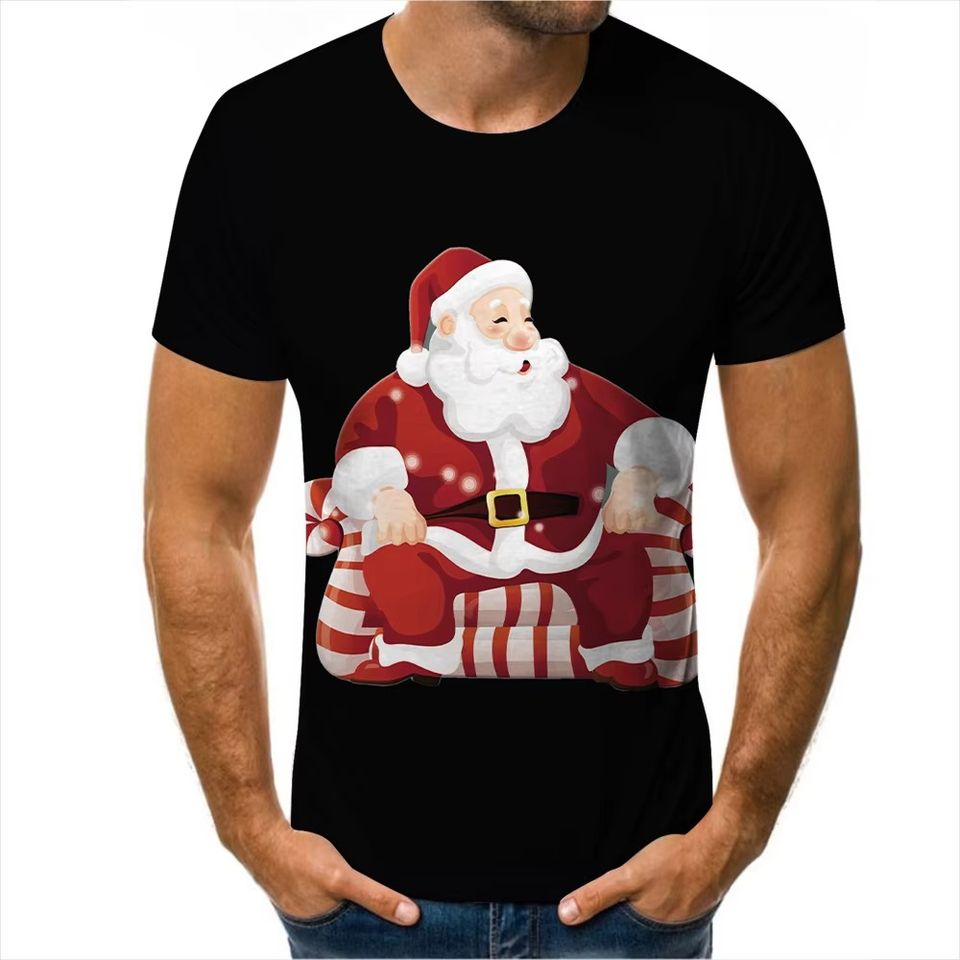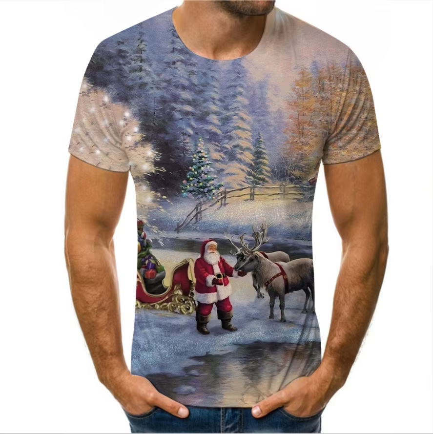 เสื้อคอกลมแขนสั้นสำหรับผู้ชายซานตาคลอสแขนสั้นพิมพ์ดิจิตอลคุณภาพสูงใหม่3D ออกแบบได้ตามต้องการ