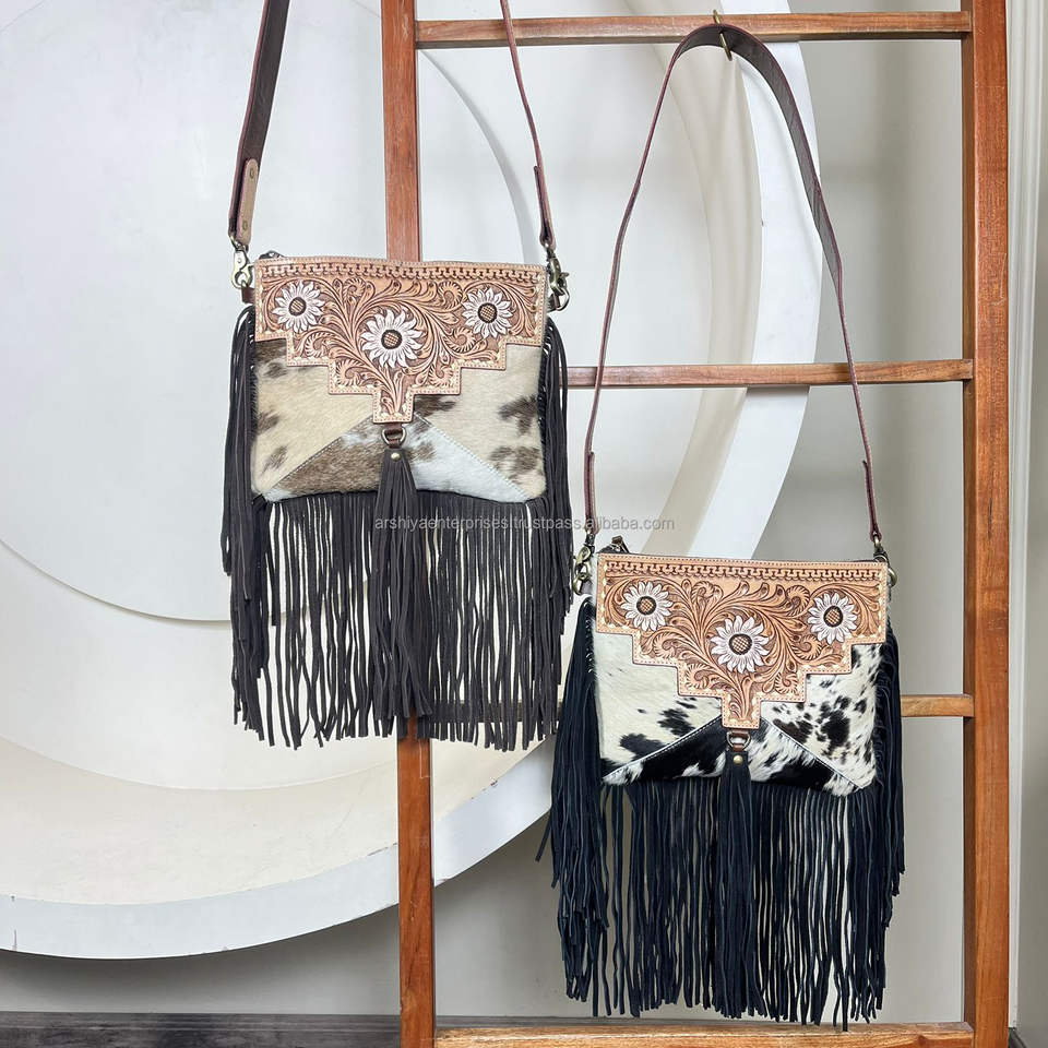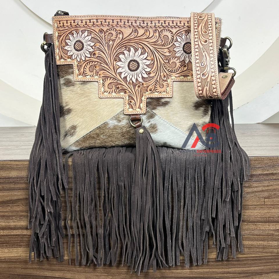 Product name:Hand Tooled Cowhide Leather Fringe Crossbody Bag