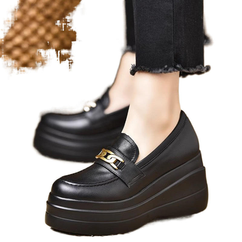 รองเท้าหนังสิทธิบัตรสำหรับผู้หญิงรองเท้าโลฟเฟอร์สีดำรองเท้าส้นหนาส้นสูงกันน้ำพื้นรองเท้าปากลึก2025