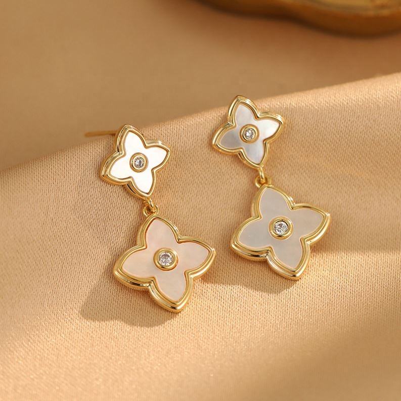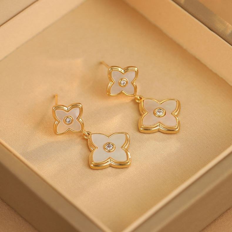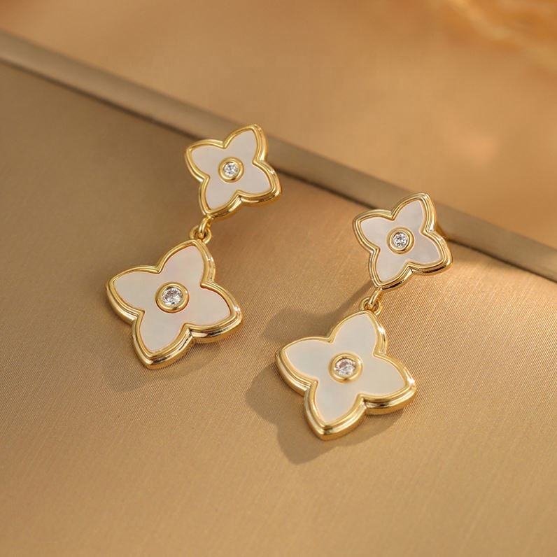 ต่างหูแบบติดหูรูปดอกไม้สี่กลีบ ดีไซน์หรูหรา ปี 2025 ทำจากทองเหลืองคุณภาพสูง ประดับด้วยเพชรซิร์คอน ดีไซน์โดดเด่นและมีสไตล์ที่ทันสมัย
