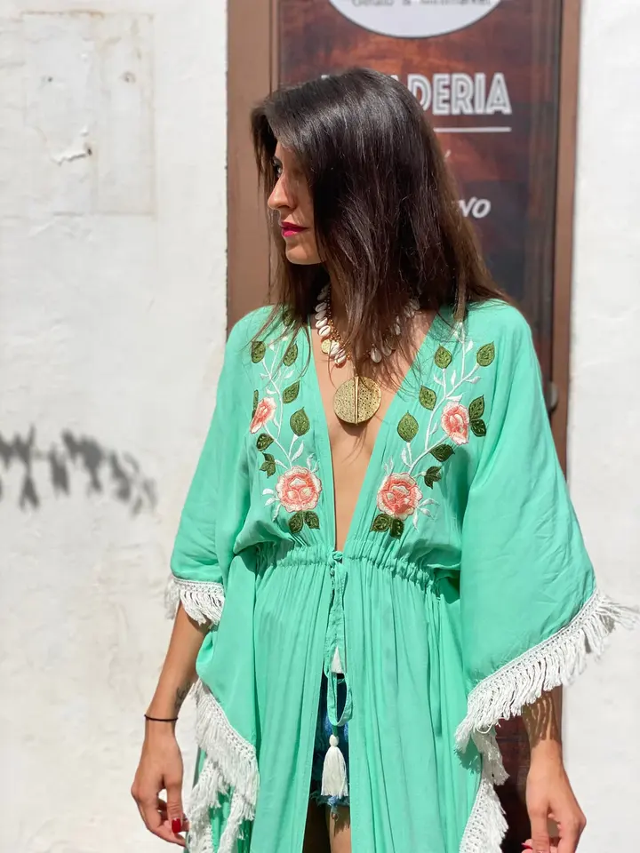 2025 Embroidery Turquoise Kimono Robe Women Clothing 3/4 Sleeve With Frills Cardigan Women Boho Festival Long Kimono for Women