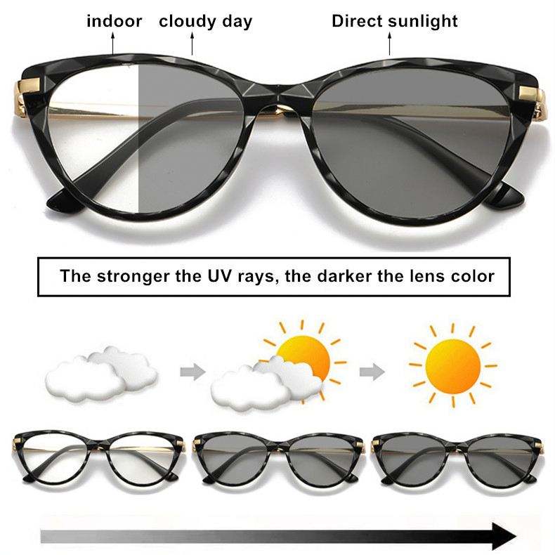 กรอบแว่นตาใสแฟชั่นผู้หญิงปี 2025 ทรงแคทอาย เปลี่ยนสีได้ ป้องกันแสงสีฟ้า