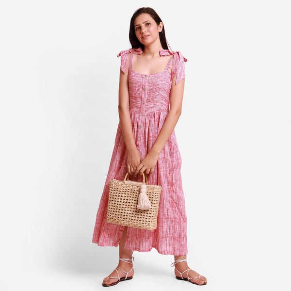 สายรัดหนา, คอกว้าง, กระโปรงจีบ, ชุดสตรีฤดูร้อน (ผ้าเรยอนนุ่ม)