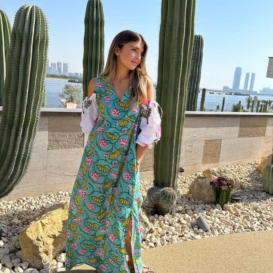 เดรสยาวลายดอกไม้พิมพ์ลายลูกไม้ติดกระดุม สไตล์ลำลองสำหรับผู้หญิง ฤดูร้อน ปี 2025 ชุดชายหาด ผ้าฝ้ายออร์แกนิค 100% ไซส์พลัส คอวี ทรงธรรมชาติ