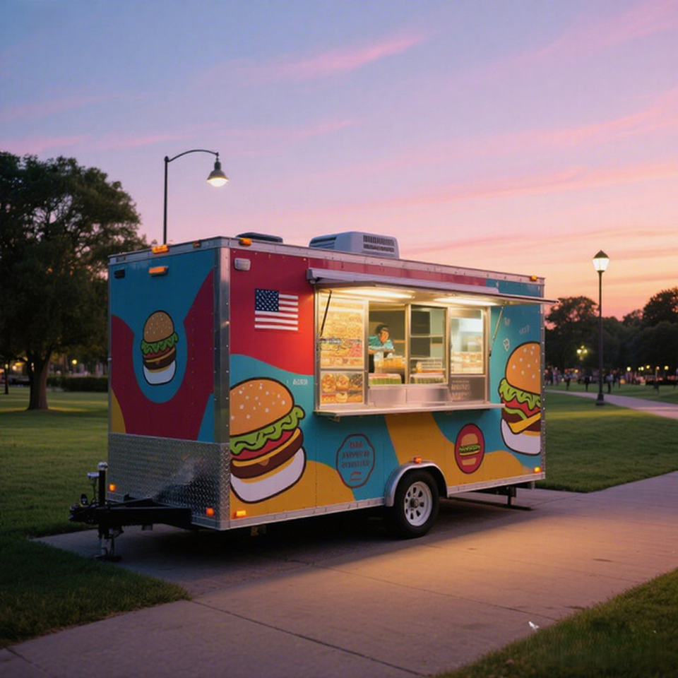 รถพ่วงเคลื่อนที่สำหรับขายอาหารแบบครบครัน ปี 2025 ผลิตในสหรัฐอเมริกา ทำจากไฟเบอร์กลาสและอะลูมิเนียม เหมาะสำหรับขายอาหารจานด่วน ขนมขบเคี้ยว และมันฝรั่งทอด