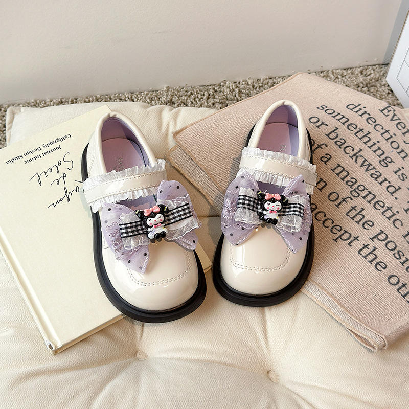 รองเท้าหนังสไตล์โลลิต้าแบบอังกฤษสำหรับเด็กผู้หญิง ปี 2025 รุ่นใหม่ ลายการ์ตูนโบว์เดี่ยว ติดตีนตุ๊กแก สีเบจ/ดำ สำหรับใส่ไปโรงเรียนช่วงฤดูใบไม้ผลิ