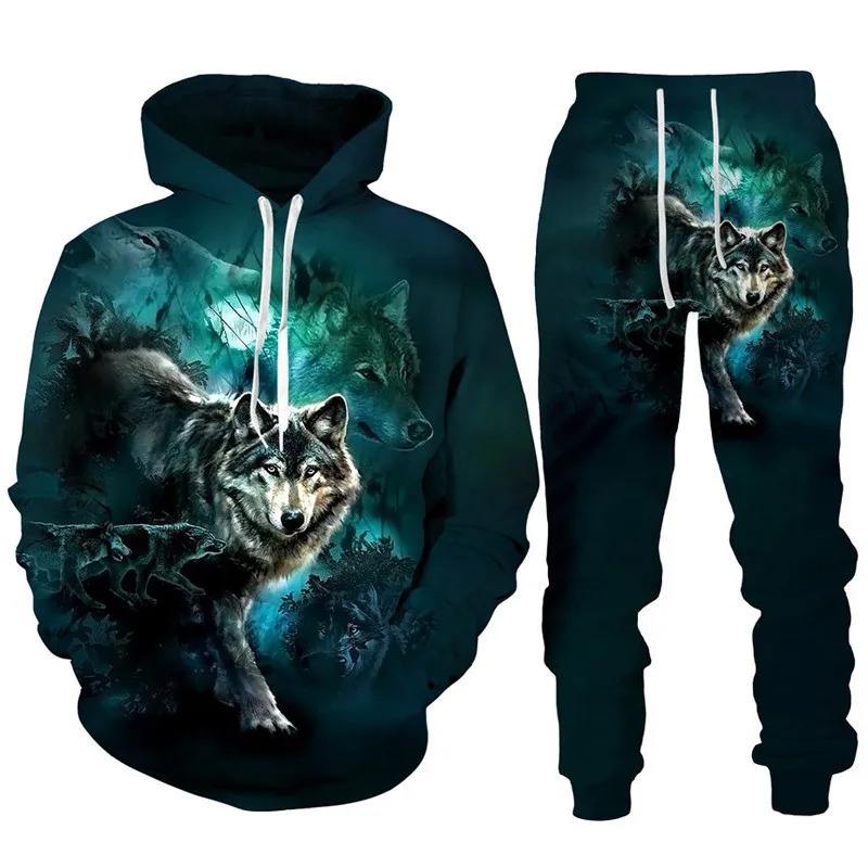 ชุดคู่2025มีฮู้ดสำหรับผู้ชายและผู้หญิงชุดสูทแฟชั่นพิมพ์ลาย3D หมาป่าเท่ป่า