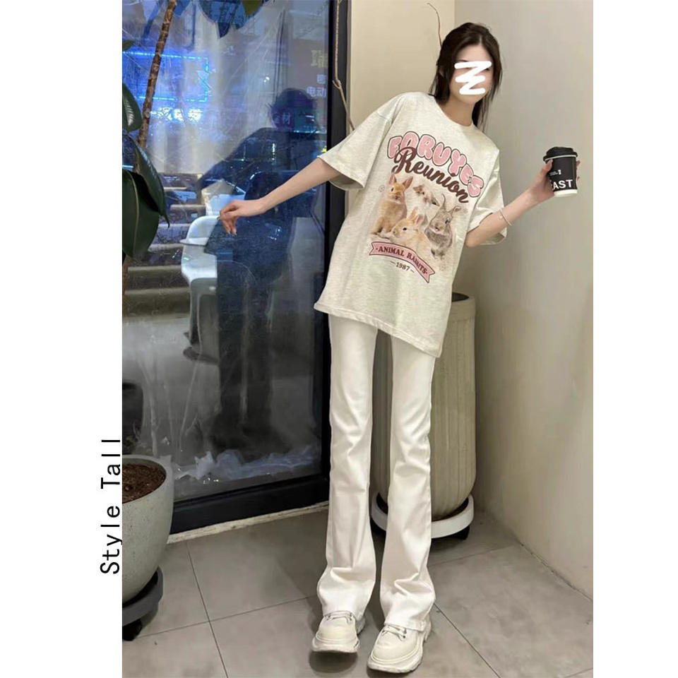 กางเกงยีนส์ขาบานสีขาวสไตล์สตรีทแบบ2025กางเกงถูผ้าบางเอวสูงทรงสลิมฟิตอเนกประสงค์สำหรับฤดูใบไม้ผลิและฤดูใบไม้ร่วง