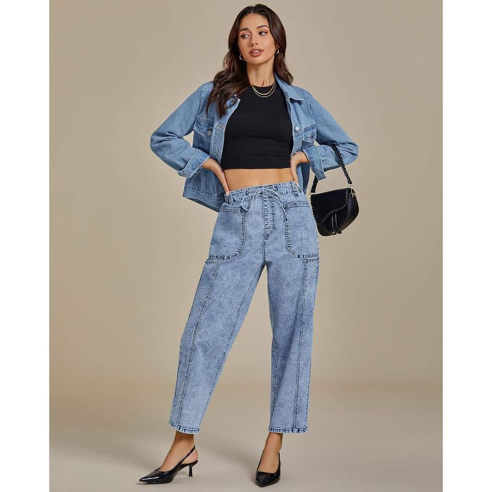 กางเกงยีนส์เอวยางยืดแบบดึงขึ้นเอวยางยืดกางเกงผ้ายีนส์ยืดมีกระเป๋าระบายอากาศได้ดีสำหรับ2025