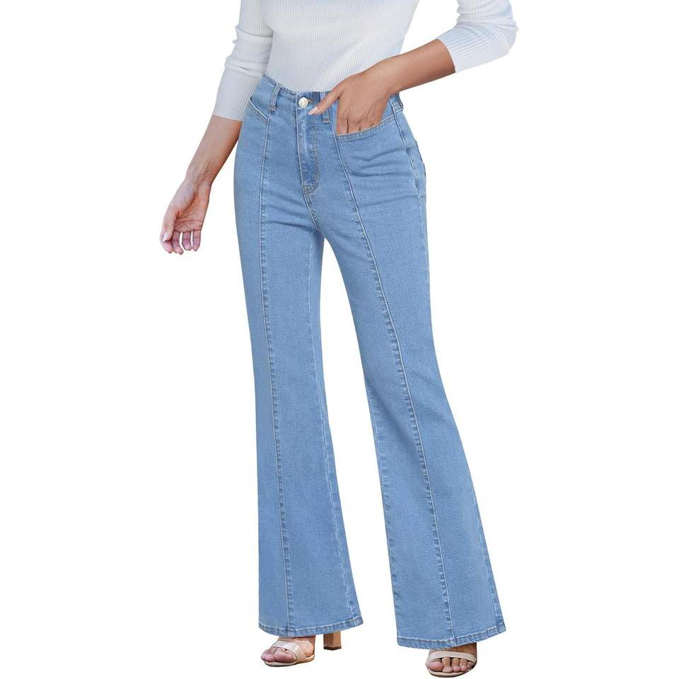 2025กางเกงยีนส์ขาบานเอวสูงสำหรับผู้หญิงกางเกงผ้ายีนส์ผ้ายืดขายาวระบายอากาศได้มีกระเป๋าทันสมัย