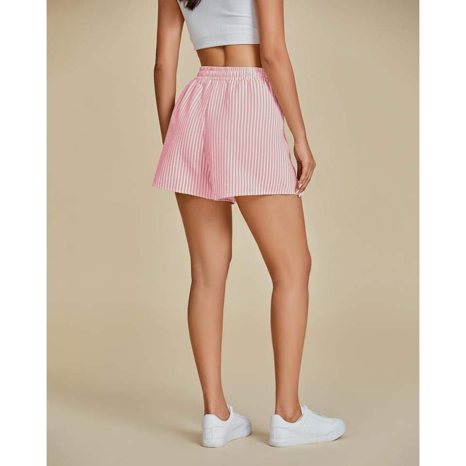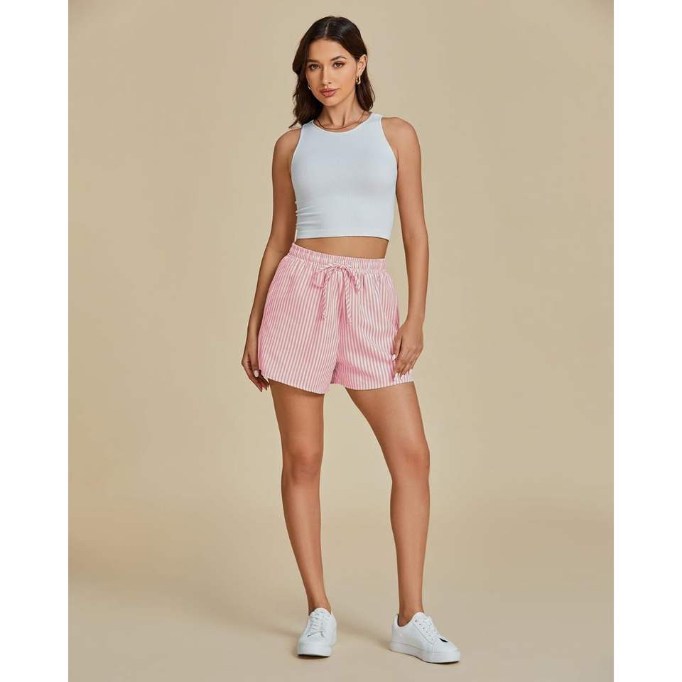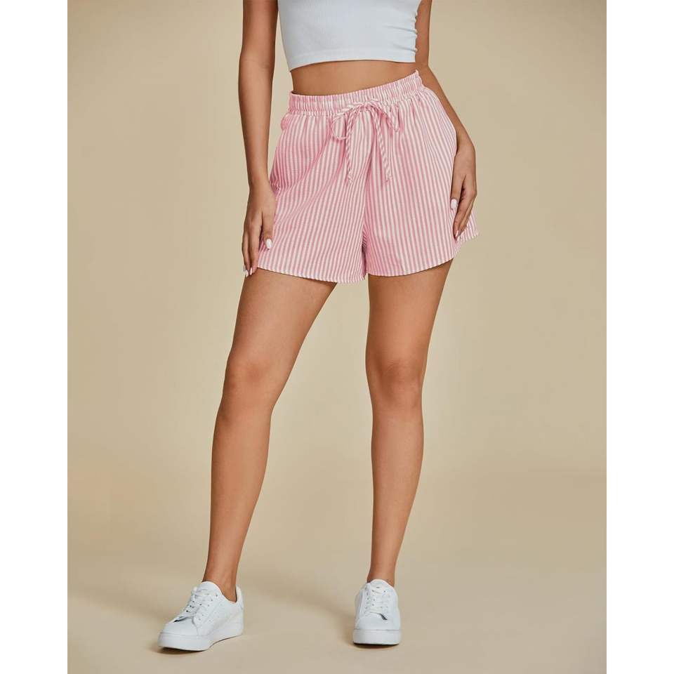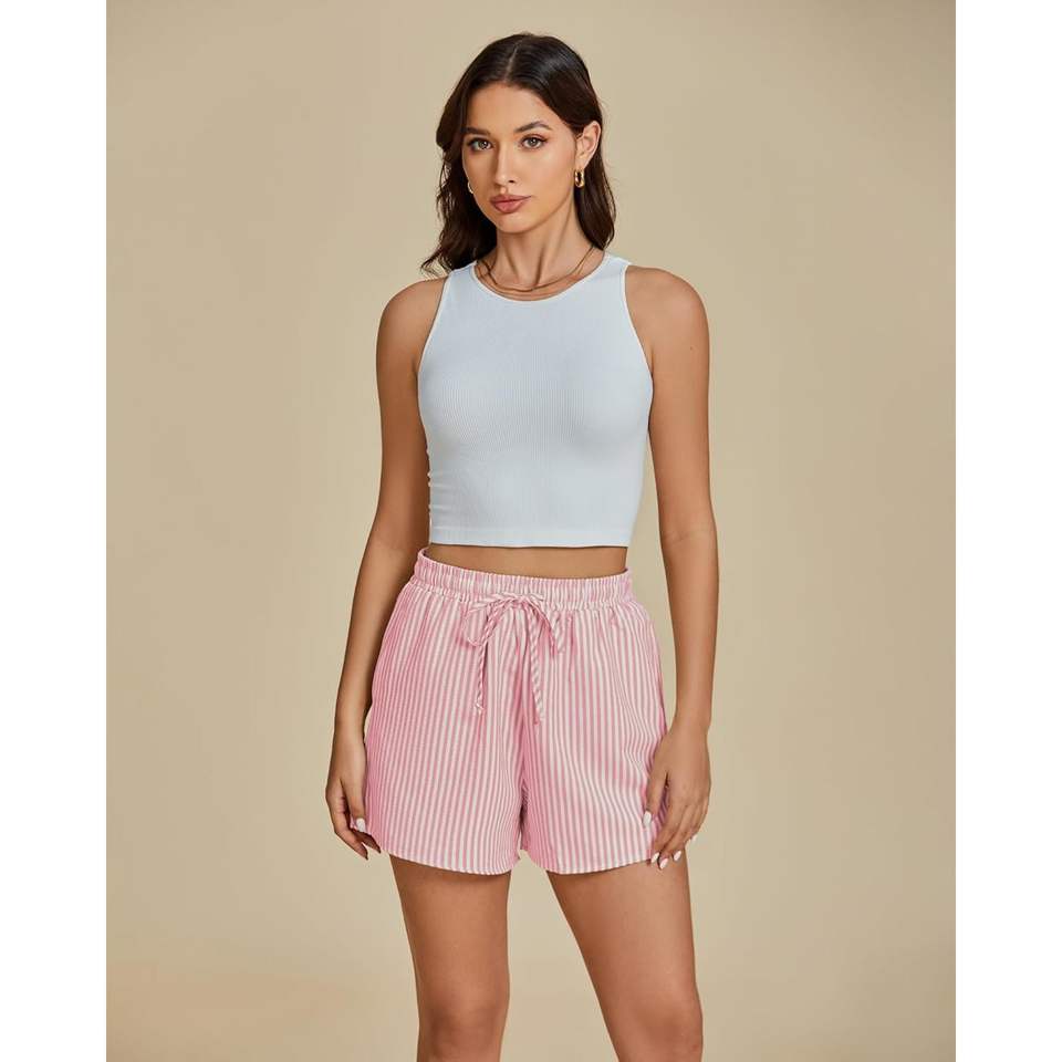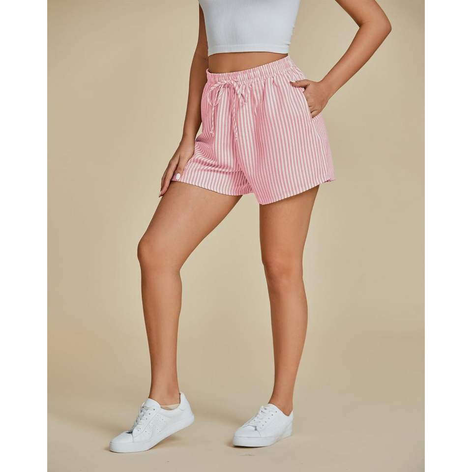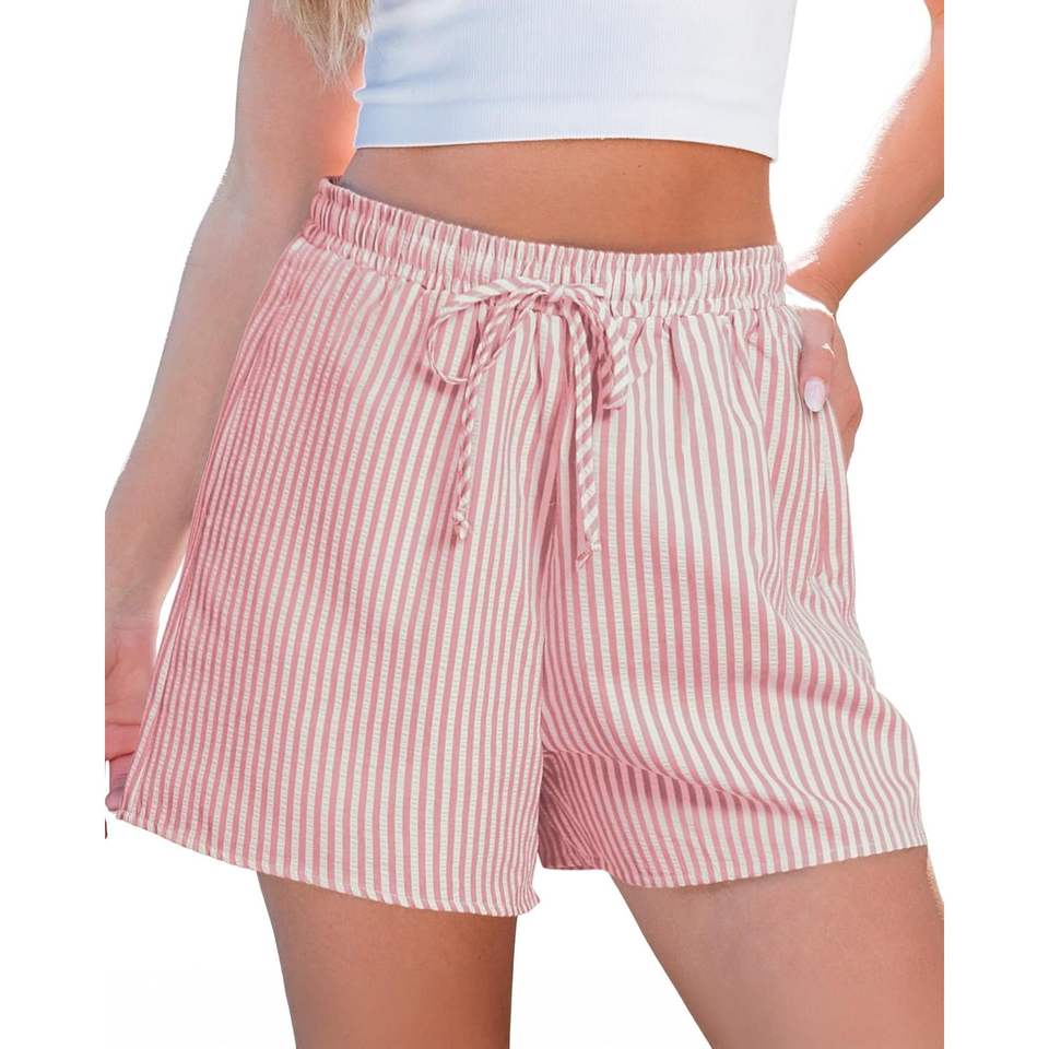 กางเกงขาสั้น2025เอวสูงสำหรับผู้หญิงกางเกงขาสั้นลายทางชายหาดผ้าฝ้ายลำลองยืดหยุ่นเอวฤดูร้อนมีเชือกดึงกระเป๋า-ไซส์ XS