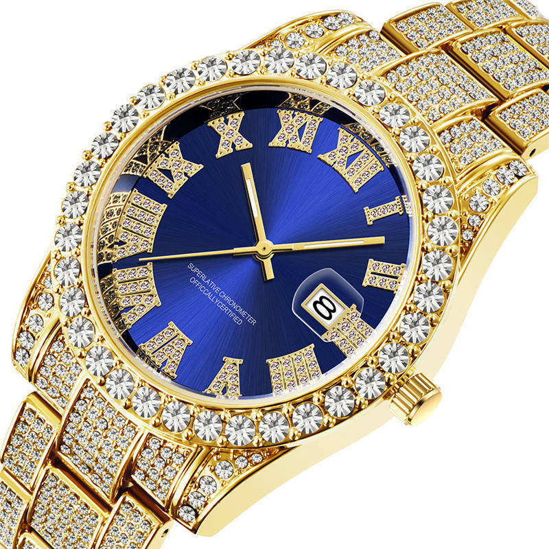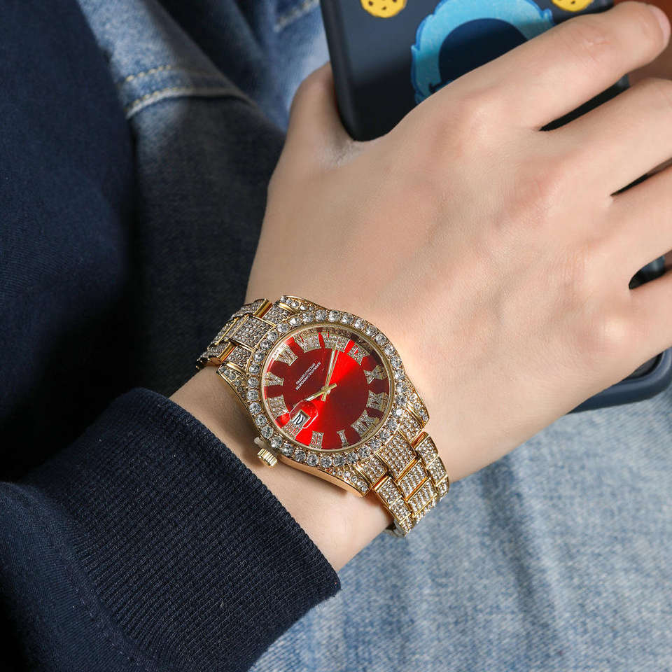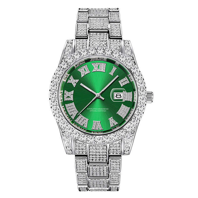 นาฬิกาควอตซ์ฮิปฮอปปี 2025 สำหรับผู้ชาย หน้าปัดสีเขียวประดับเพชร ตัวเลขโรมัน กันน้ำ ขนาด 42 มม. หน้าปัดใหญ่ แฟชั่นทันสมัย แบรนด์โดดเด่น