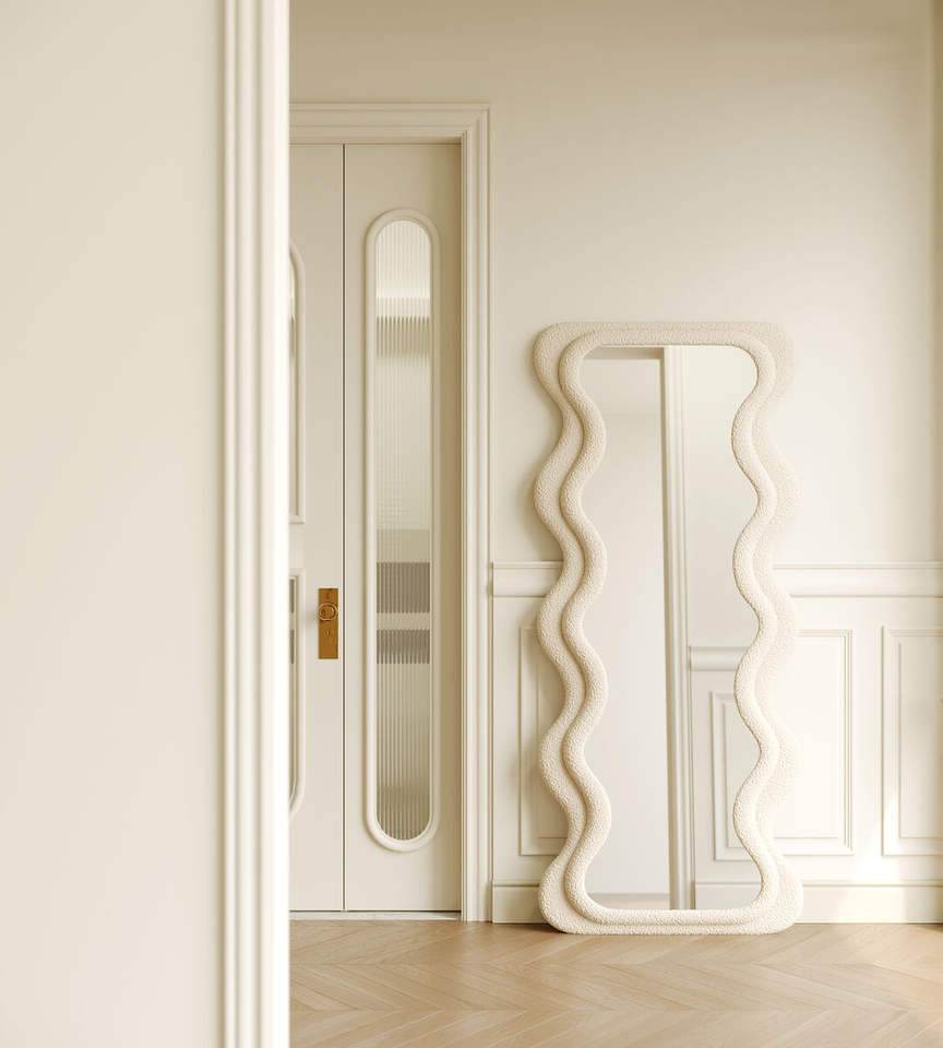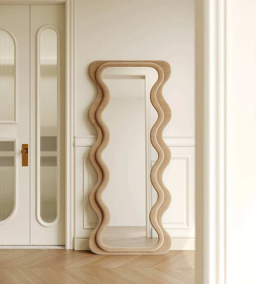 กระจกตั้งพื้นแบบเต็มตัว ดีไซน์โค้งเว้า รุ่นปี 2025 สไตล์ยุโรปเหนือ เหมาะสำหรับตกแต่งห้องนอนช่วงคริสต์มาส พร้อมกรอบ