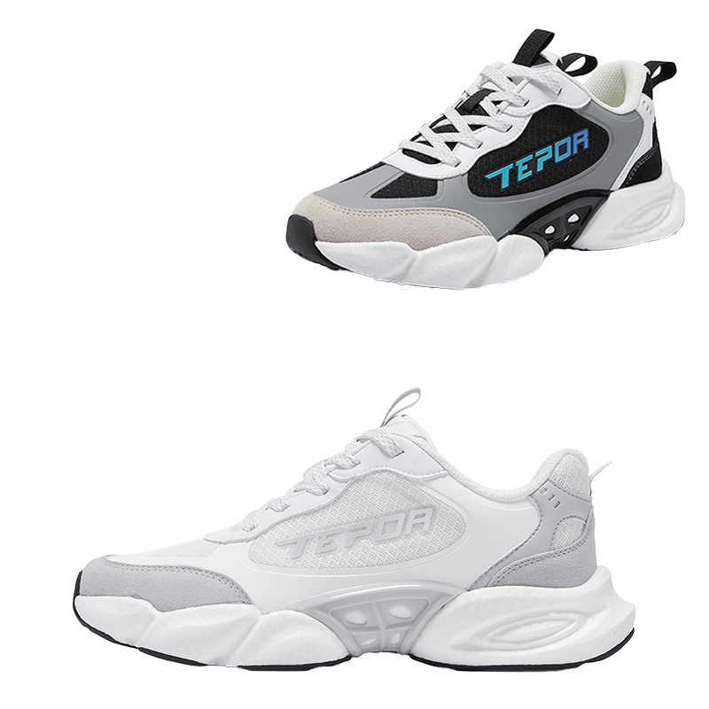 CLZ946 รองเท้ากีฬาผู้ชายผูกเชือกสีขาวสีดําพื้นรองเท้าสูงหยักหนา