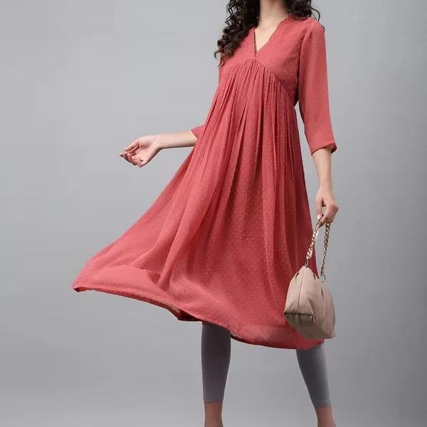 ชุดคุर्ติสไตล์อินเดีย-ปากีสถานสำหรับผู้หญิงจาก AK Fashion สีแดงพิมพ์ลาย คอวี ทรงเข้ารูป ผ้ากอร์เจ็ตต์ แห้งเร็ว ป้องกันแสงแดด