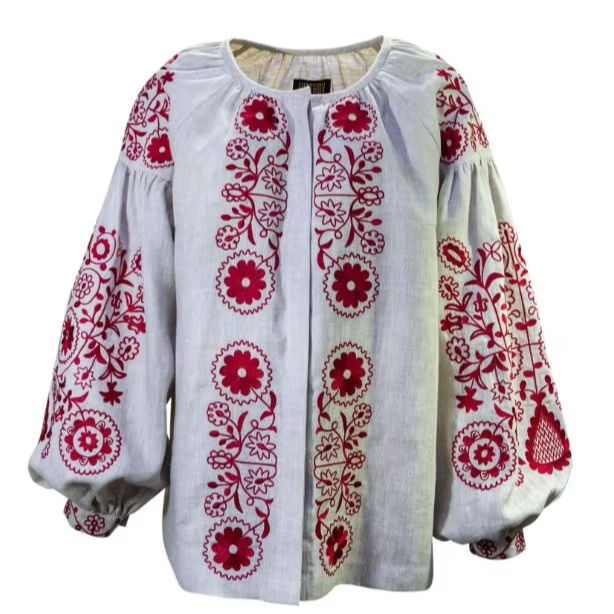 2025เสื้อคอกลมแขนบอลลูนปักลายดอกไม้สำหรับผู้หญิงเสื้อใส่ในสำนักงานแบบลำลองปักลายดอกไม้