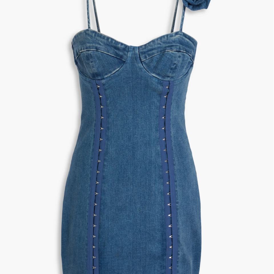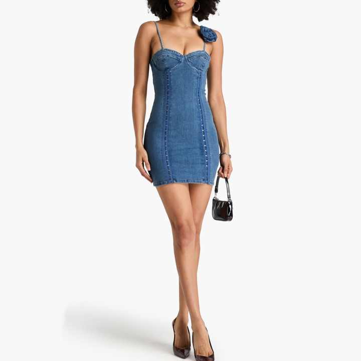 เดรสยีนส์สุดฮอตขายดีประจำปี 2025 สำหรับฤดูร้อน ดีไซน์เซ็กซี่ทันสมัย ทรงเข้ารูป แต่งดอกกุหลาบ 3 มิติ แบบเปิดหลัง ความยาวมินิเดรสสำหรับผู้หญิง