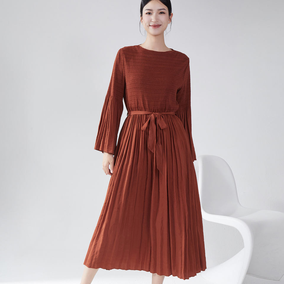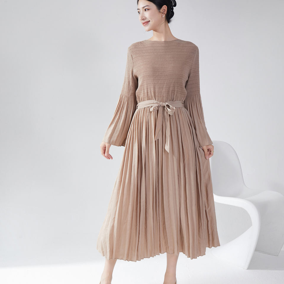 2025เดรสแขนยาวสำหรับผู้หญิงชุดราตรีหรูหรามีจีบระดับไฮเอนด์ทรงหลวมทรงเอไลน์