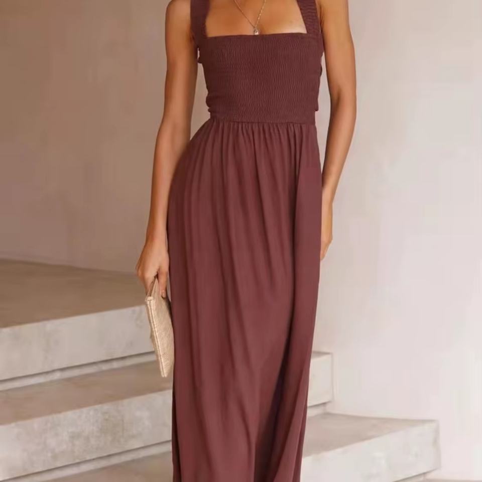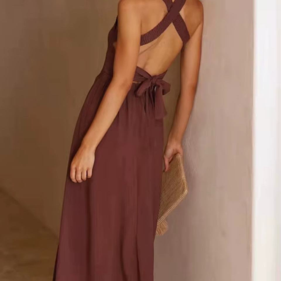 เดรสผ้าลินินลำลองสำหรับผู้หญิง รุ่นใหม่ล่าสุดปี 2025 ขายส่ง เดรสยาวสำหรับวันหยุดฤดูร้อน ผ้าฝ้าย เซ็กซี่ สายคล้องคอ เปิดหลัง