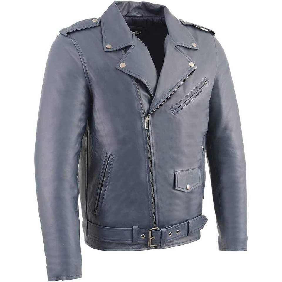 แจ็คเก็ตหนังสีน้ำเงินคลาสสิกสำหรับผู้ชาย รุ่น SFM1890 ปี 2025 เหมาะสำหรับขี่มอเตอร์ไซค์และแข่งรถ
