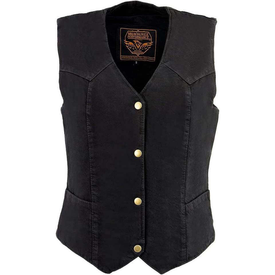 เสื้อกั๊กหนังสีดำสำหรับผู้หญิง ปี 2025 สไตล์นักขี่มอเตอร์ไซค์ ทำจากผ้ายีนส์ พร้อมกระดุมแป๊ก 4 ตัว สำหรับใส่แข่งรถ