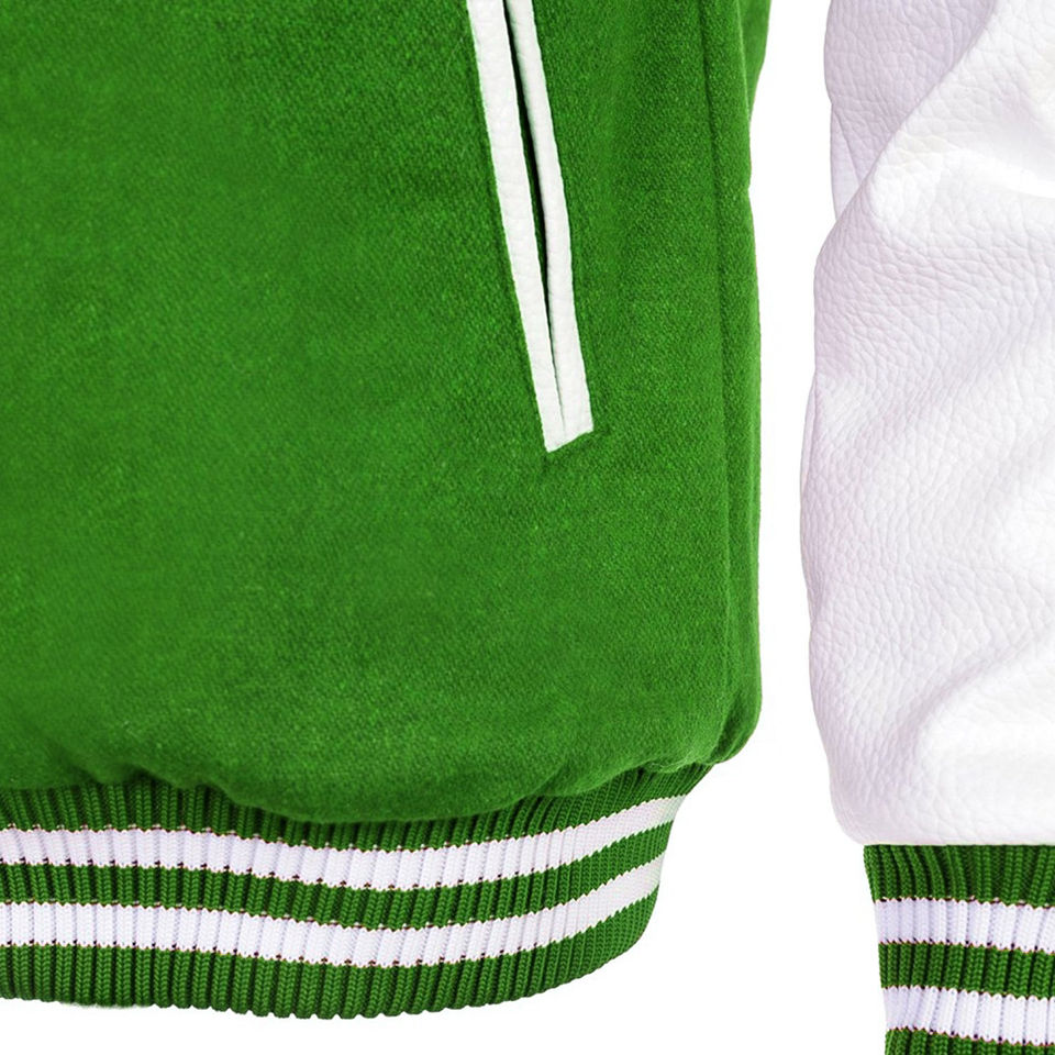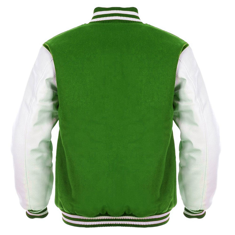 2025เลตเทอร์แมนแจ็คเก็ตทีมฟุตบอลสไตล์โรงเรียนแขนเสื้อหนังสีเขียวขนแกะสีขาวคอตั้งด้านหน้าป้องกันรังสียูวี