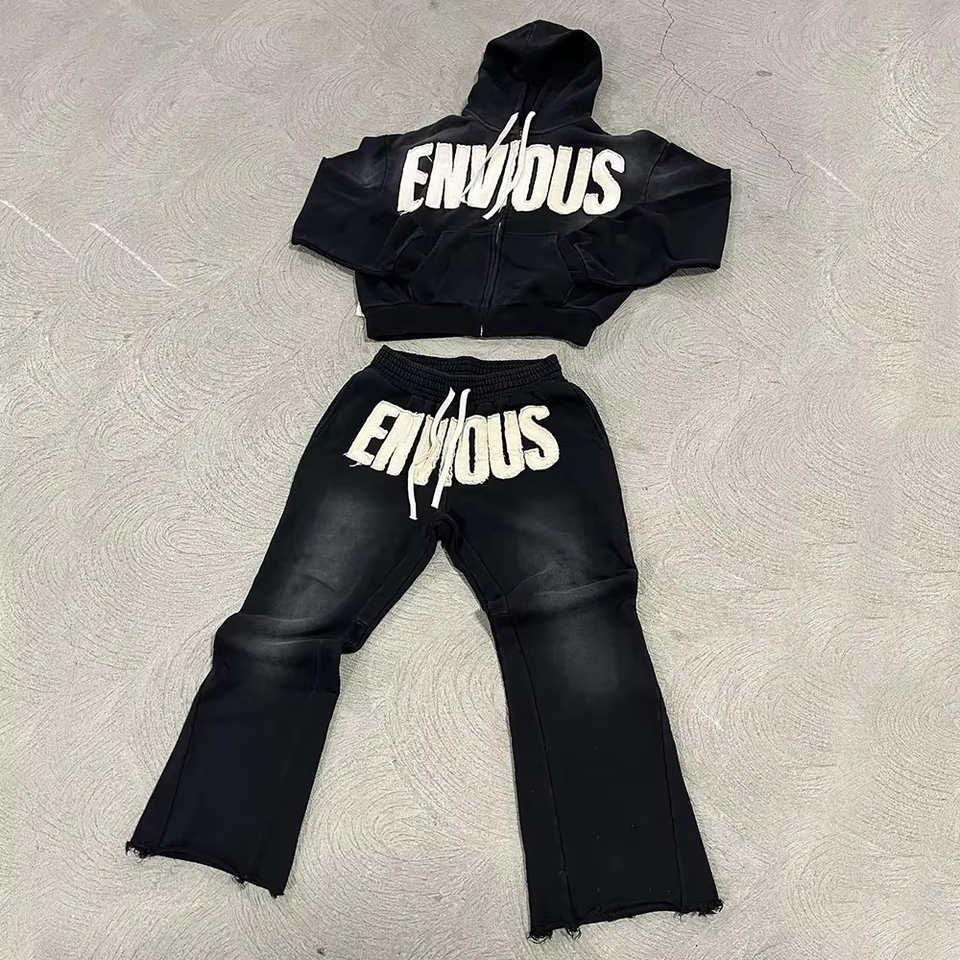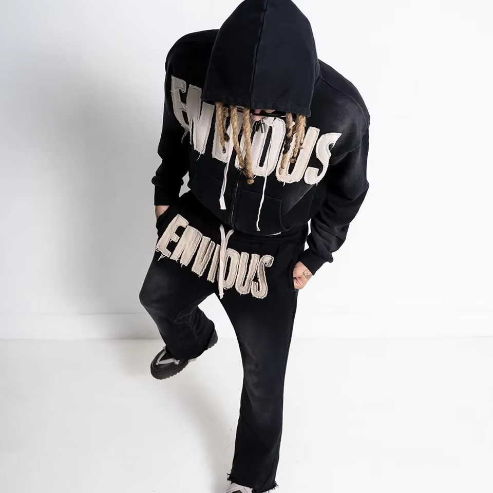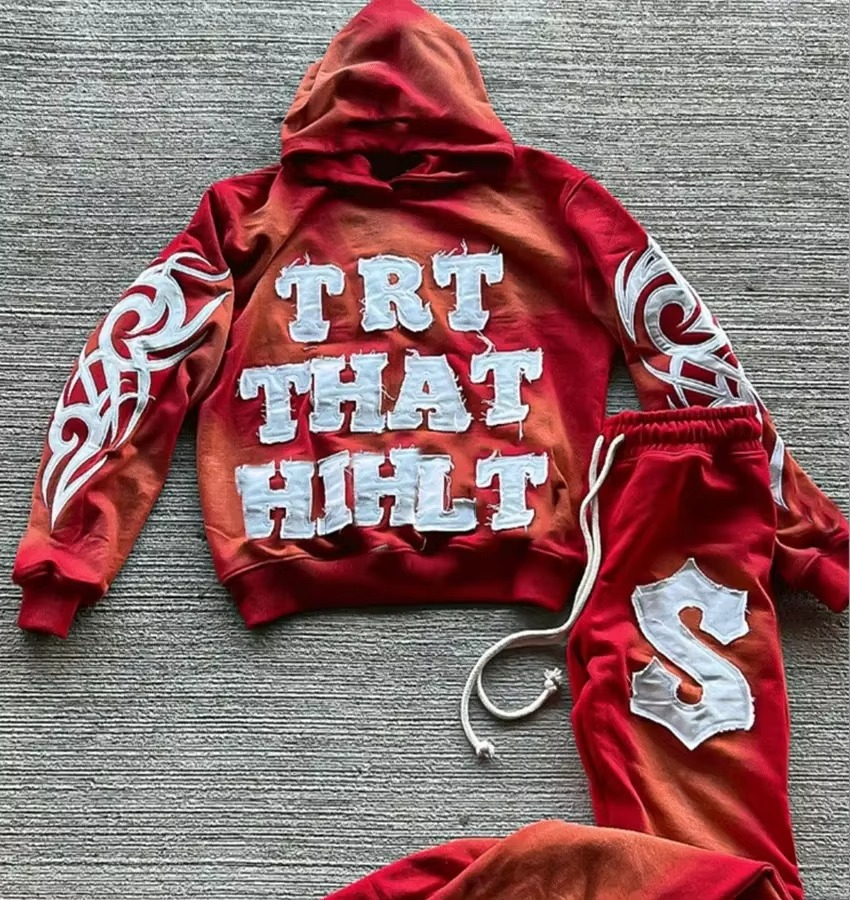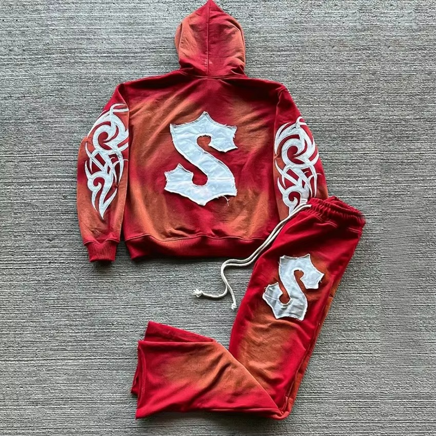 เสื้อสเวตเตอร์ปักลายสำหรับผู้ชายชุด2025แนวสตรีทกางเกงวอร์มและมีฮู้ดชุดเสื้อผ้าล้างกรดซีดแสงแดด