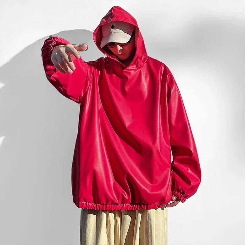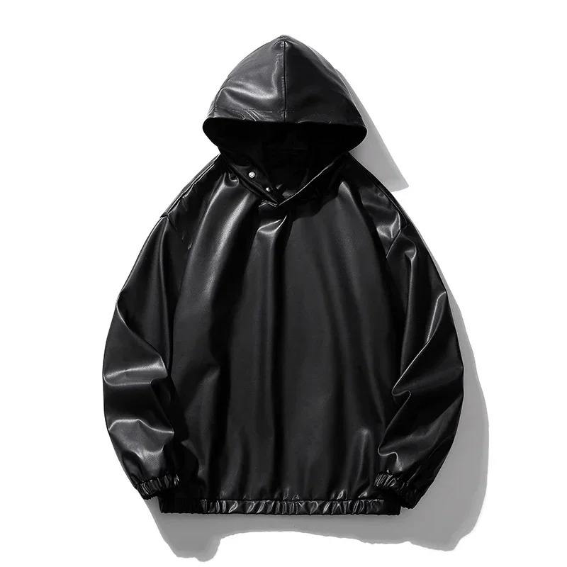 2025เสื้อสเวตเตอร์มีฮู้ดผู้ชาย, เสื้อแขนยาวมีฮู้ดหนัง PU มีฮู้ดเสื้อสวมหัวแนวสตรีทแฟชั่นลำลองกันน้ำ