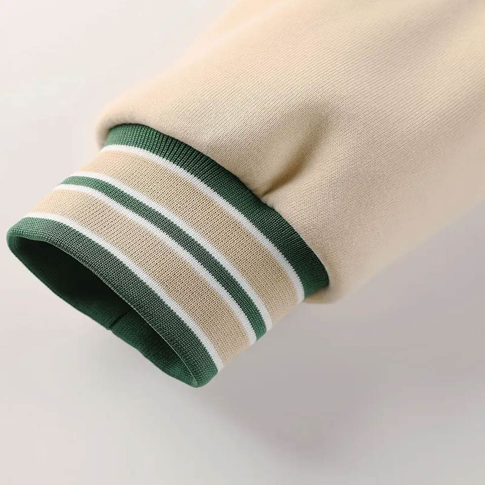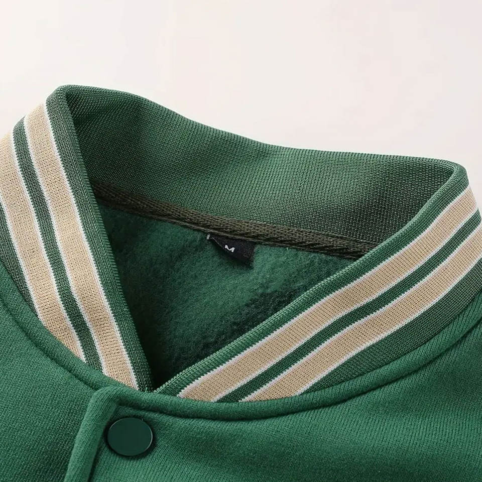 2025 Men Vintage Athletic Varsity Jacket Embroidered Green Design Stand Collar Front Coated Fabric Customizable Colors Sizes