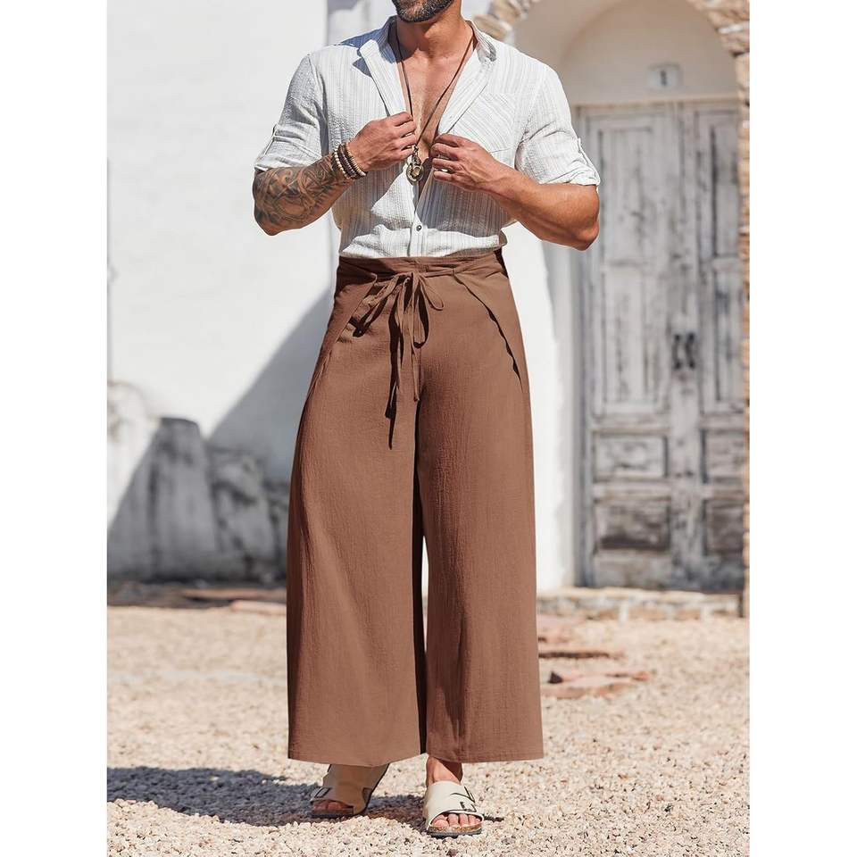 2025กางเกง100% ผู้ชายผ้าลินินผ้าฝ้ายผสมลินินสไตล์ชาวประมงไทยโยคะชายหาดฮิปปี้ทรงหลวมป้องกันรอยยับย้อมธรรมดา