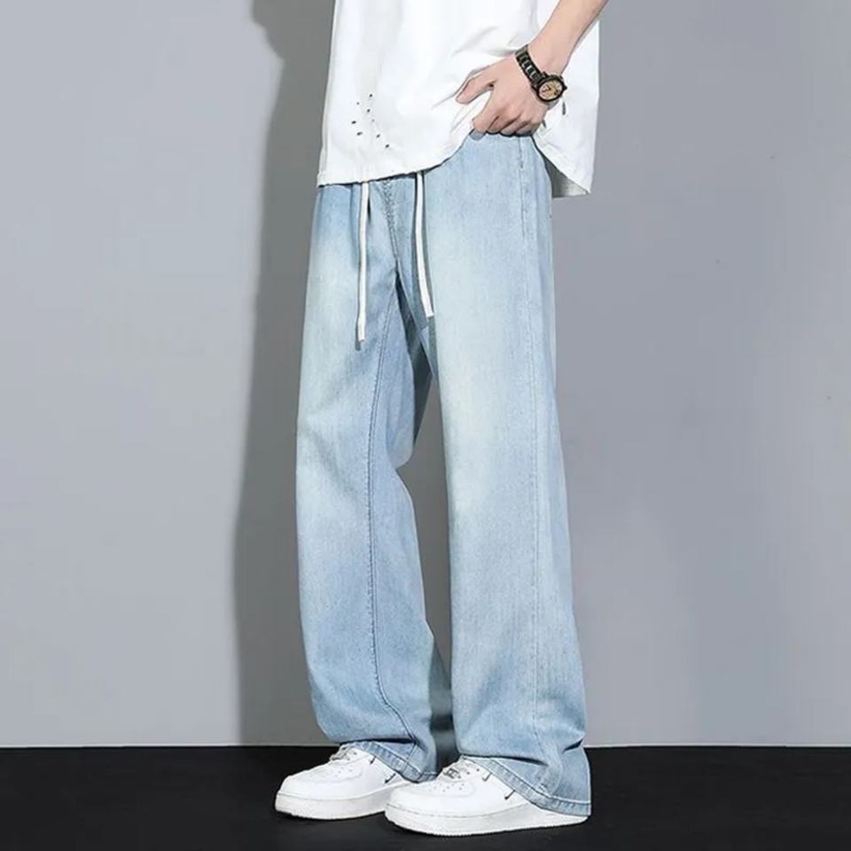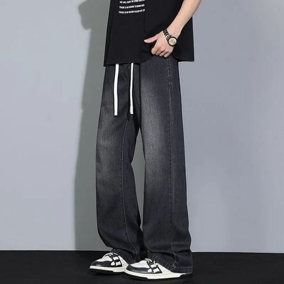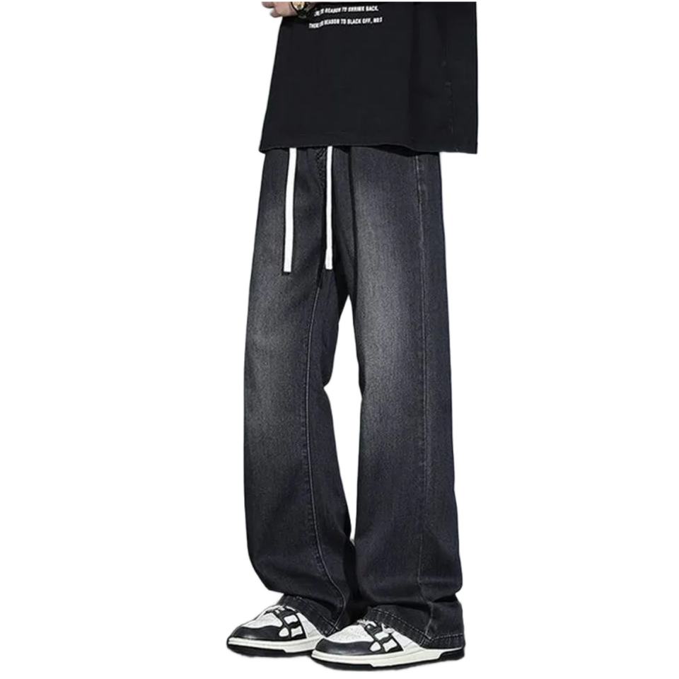 กางเกงยีนส์ทรงขาบานสไตล์แบ็กกี้สำหรับผู้ชาย ปี 2025 | กางเกงยีนส์ผู้ชายทรงหลวมสไตล์สตรีทแวร์ มีเชือกผูกเอว กางเกงยีนส์เดนิมเอวสูงสำหรับผู้ชาย
