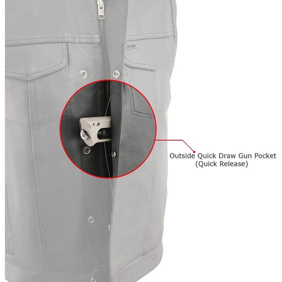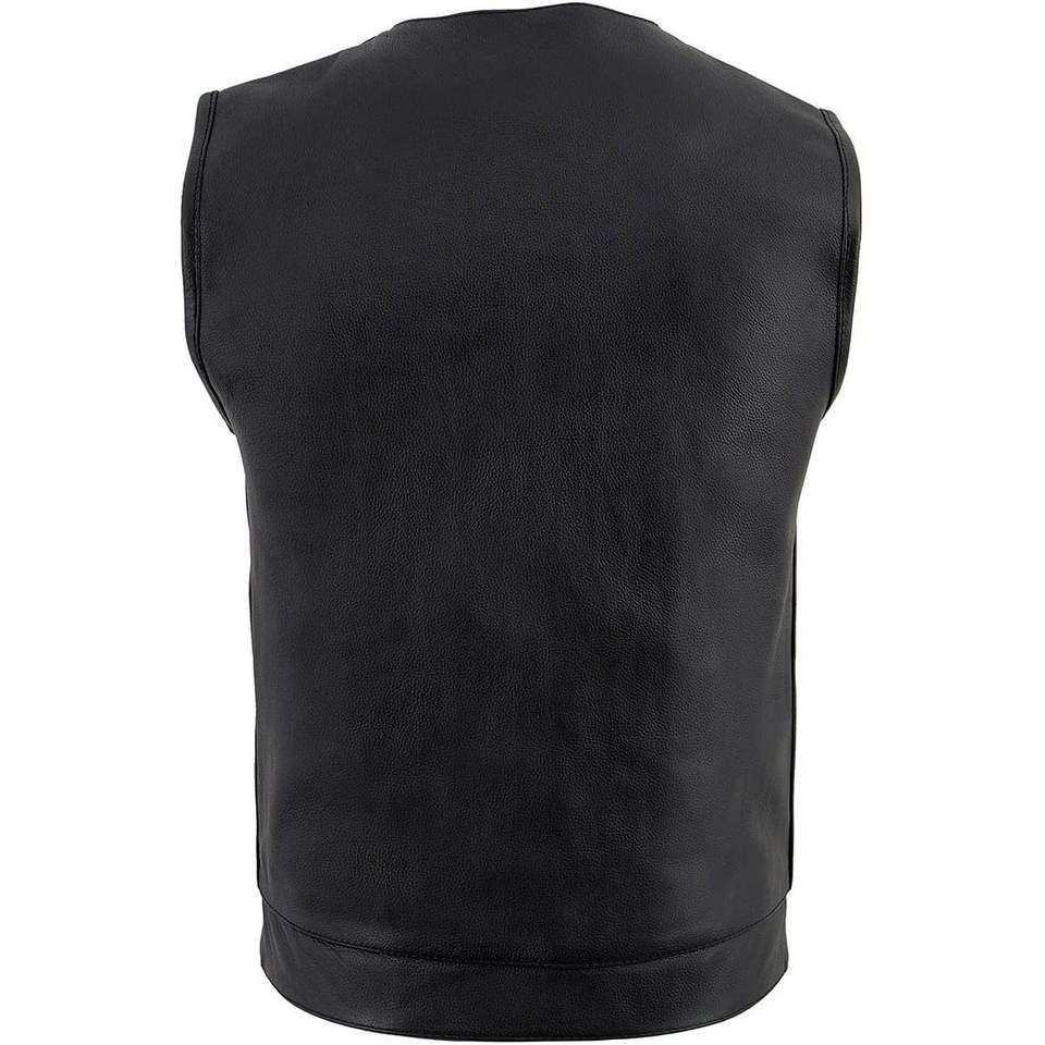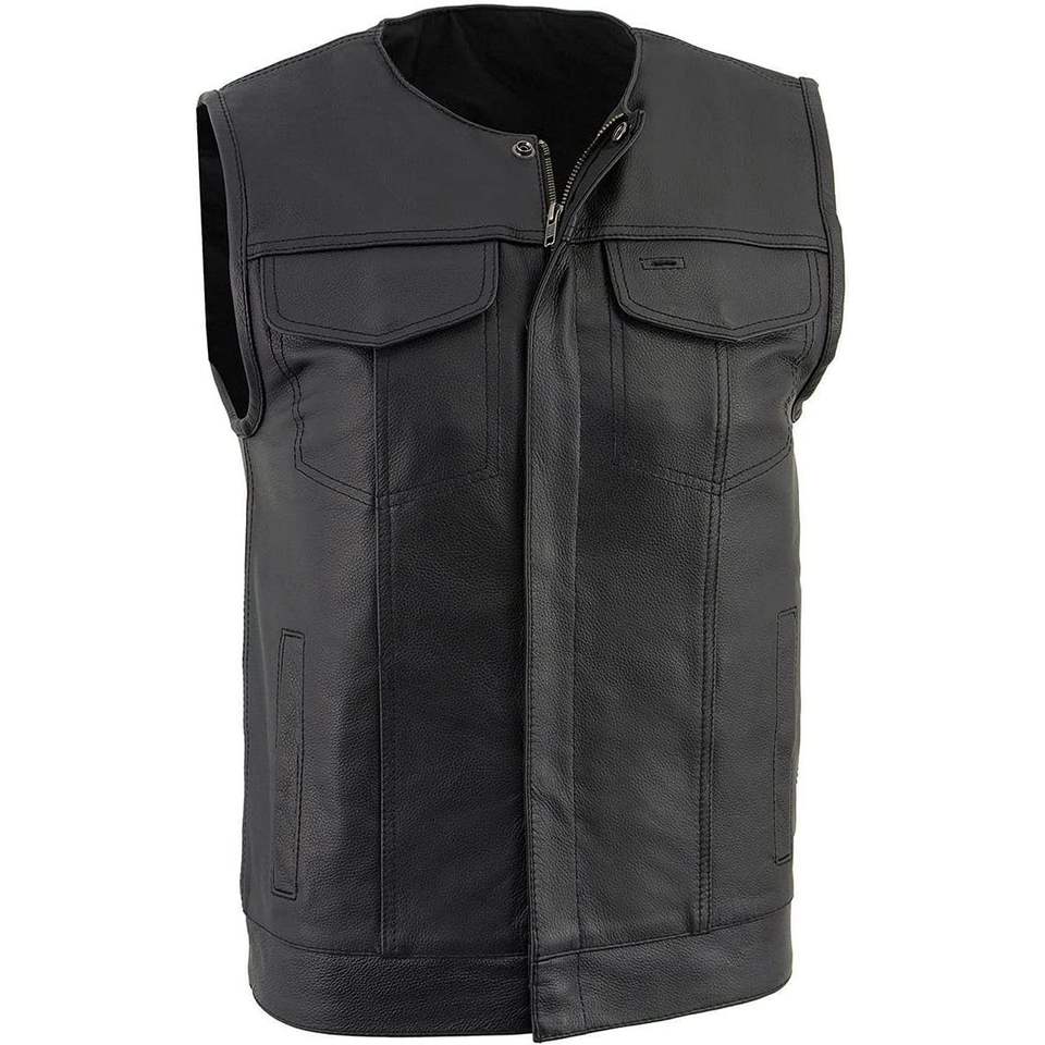 เสื้อกั๊กขี่มอเตอร์ไซค์หนังสีดำไม่มีปกสำหรับผู้ชาย2025 LKM3711ที่มีการปิดด้านหน้าแบบคู่สำหรับใส่แข่งรถมอเตอร์ไซค์และยานยนต์