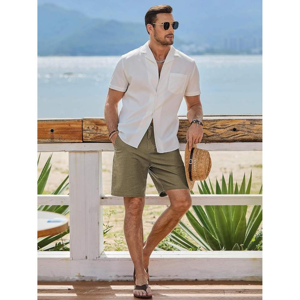 2025กางเกงขาสั้นลำลองผ้าลินินผ้าฝ้ายผู้ชาย, กางเกงขาสั้นชายหาดมีกระเป๋าเอวสูงสไตล์สตรีท XS เอวยางยืดถัก
