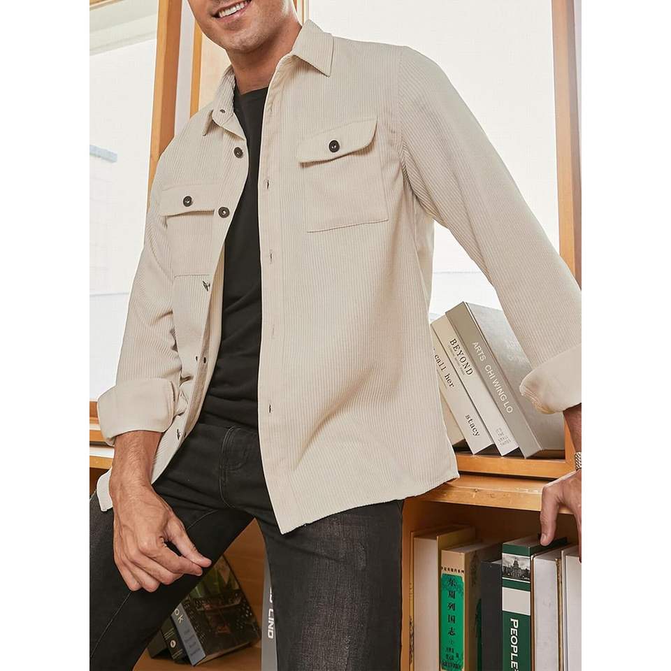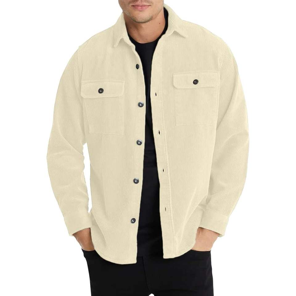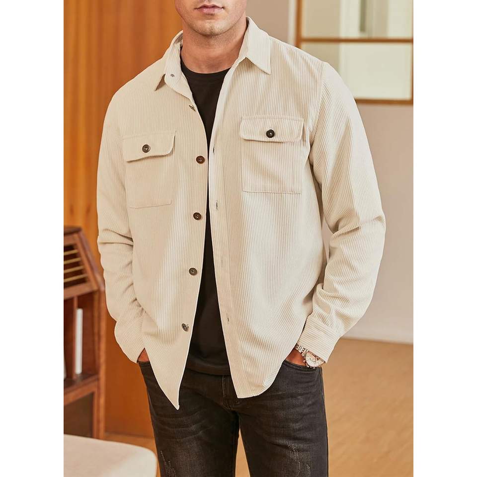 2025เสื้อแจ็คเก็ตแขนยาวมีกระดุมแบบลำลองของผู้ชายเสื้อแจ็คเก็ตผ้าลูกฟูกแบบผ่าหน้ามีกระเป๋า