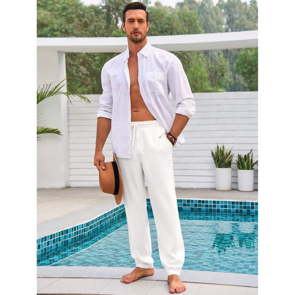 กางเกงเชือกผูกผ้าลินินลำลองของผู้ชาย2025มีซิปตกแต่งเอวยางยืดทรงหลวมน้ำหนักเบาเหมาะกับฤดูร้อนเล่นโยคะชายหาด