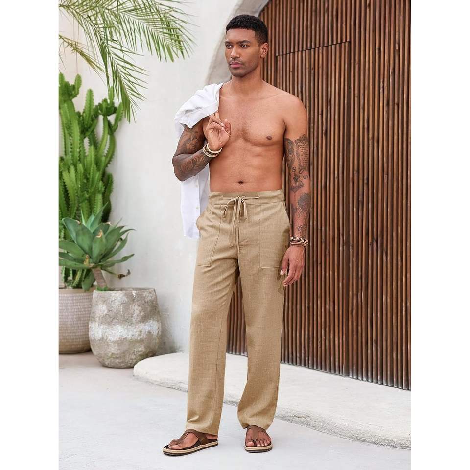 กางเกง2025ผ้าลินินลำลองสำหรับผู้ชายกางเกงโยคะชายหาดผ้าฝ้าย100% เอวยางยืดมีเชือกผูกน้ำหนักเบาไม่ยับสำหรับฤดูร้อน