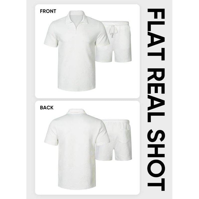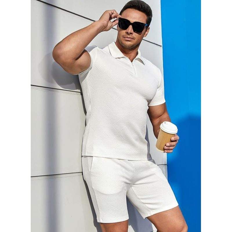 2025เซ็ตเสื้อโปโลแขนสั้นลำลองสำหรับผู้ชายชุดถัก2ชิ้นสีพื้นลายเรขาคณิตผ้าเนื้อเรียบ