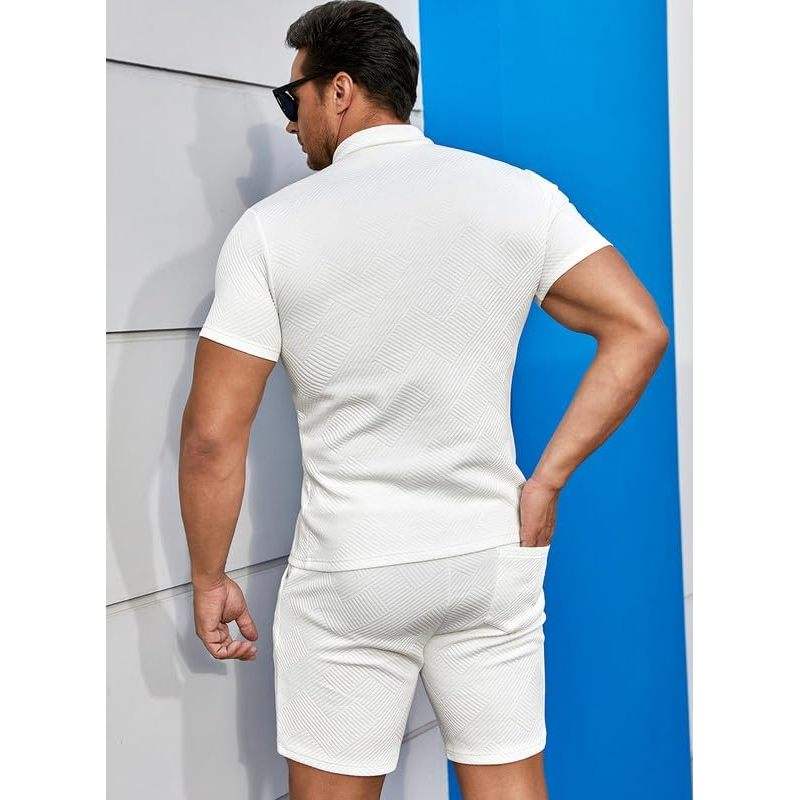 2025เซ็ตเสื้อโปโลแขนสั้นลำลองสำหรับผู้ชายชุดเสื้อสเวตเตอร์ถัก2ชิ้นเนื้อเรขาคณิตสีพื้น