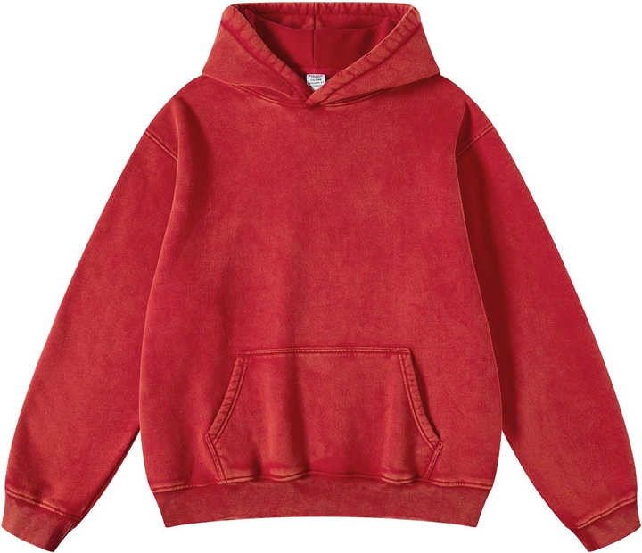 เสื้อฮู้ดดี้ลำลองผู้ชายปี 2025 คุณภาพสูง ปักลาย ผ้าฝ้ายผสมขนแกะ สีแดงซันเฟด ล้างสีแบบแอซิดสโตนวอช ดีไซน์ดิสเทรส